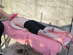 Outdoor Erotik-Massage mit heißen asiatischen Brünetten Babes im Einsatz
