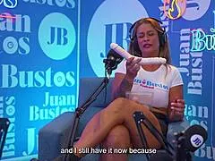 Hot MILF with huge boobs rides a sybian while reading news live on air.
